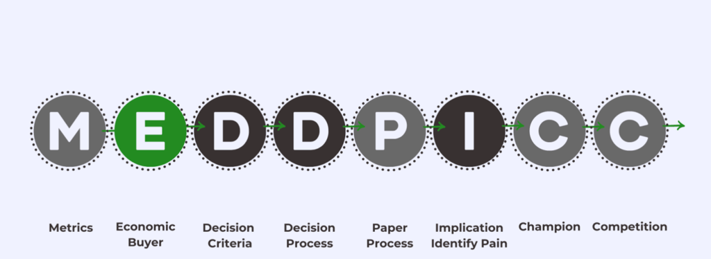 The acronym stands for Metrics, Economic Buyer, Decision Criteria, Decision Process, Paper Process, Implications, Champion, and Competition.